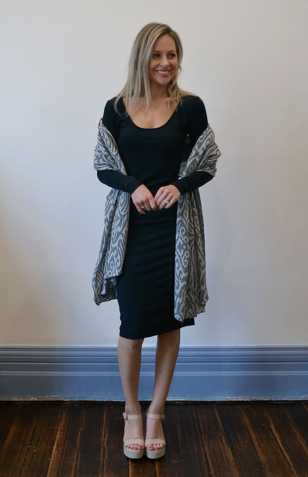 Classic body fitted "little black dress" in very forgiving rib fabric that does not cling but floats over the body.
